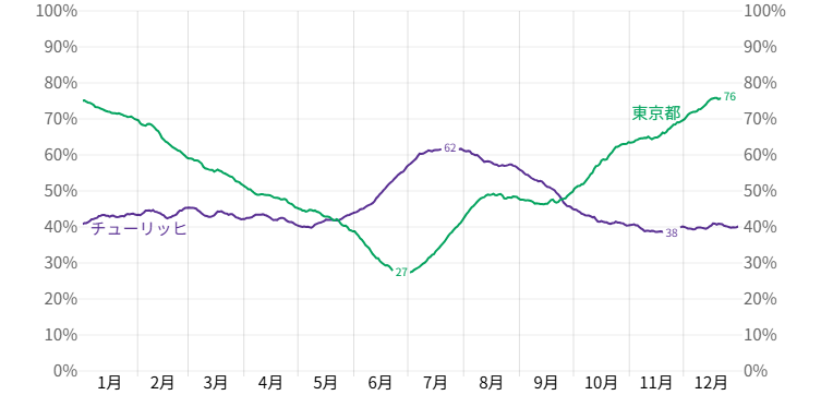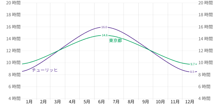 以下はチューリッヒと東京の日照時間と